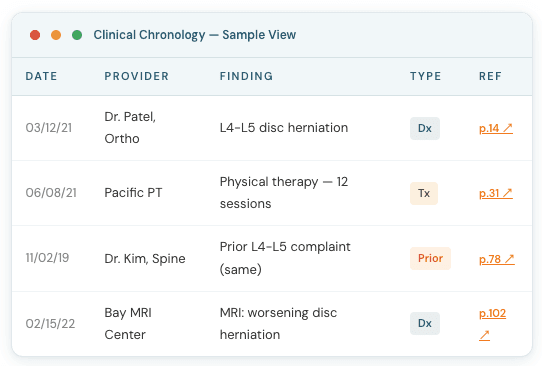 Medical-legal review is inherently analytical. ChartInsight is engineered to support this reasoning process by delivering an issue-oriented medical chronology — not just a page index.